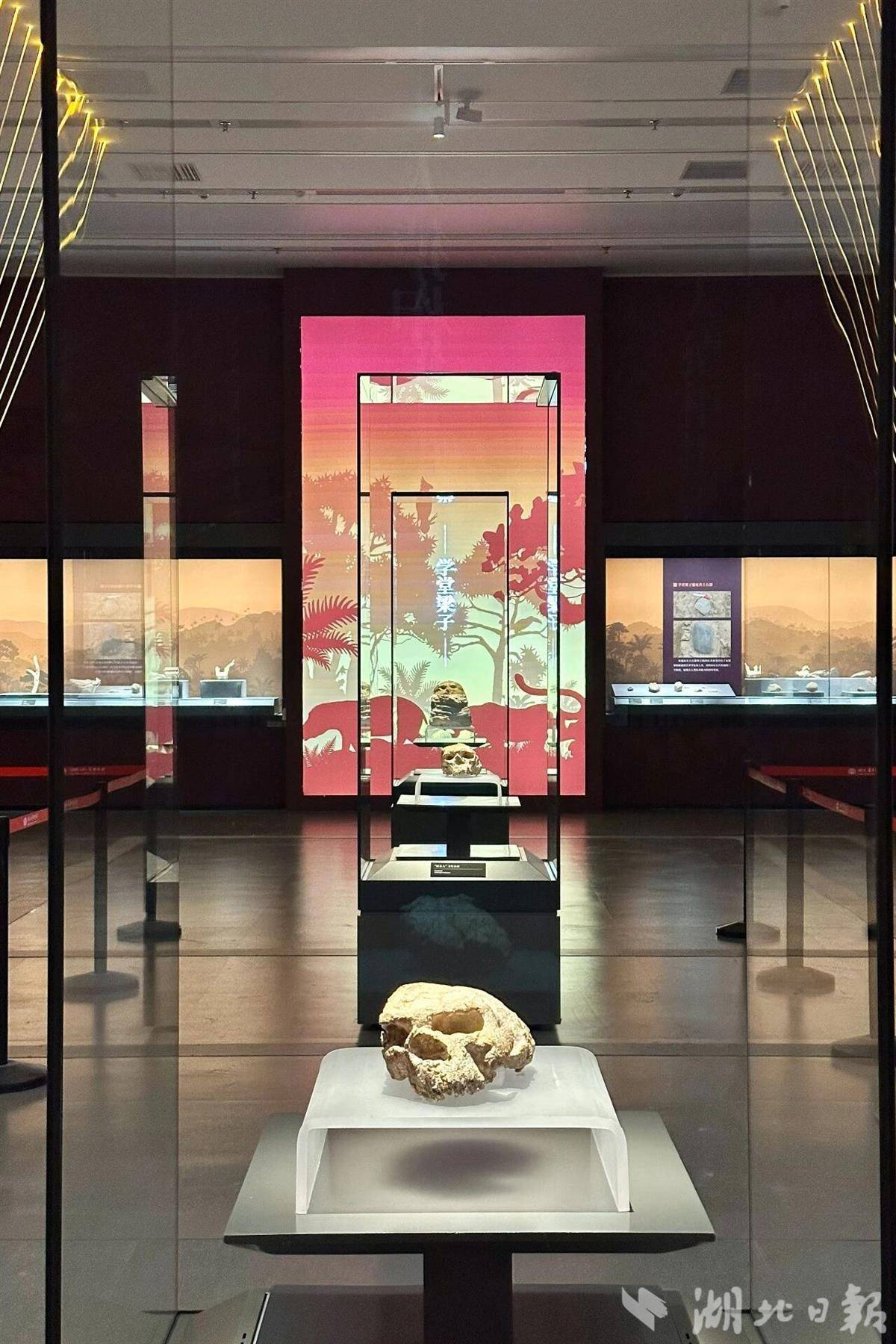 “郧县东谈主”1号、2号头骨化石及3号头骨出土模子,在“探源溯流——‘十四五’时辰湖北考古效果展”相聚