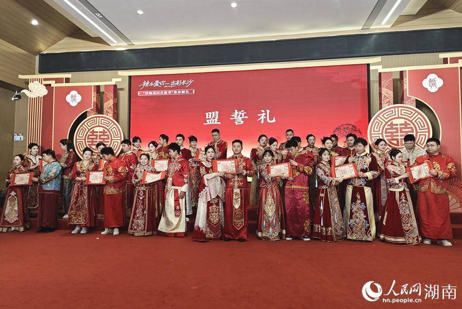 这次集体婚典玄妙交融了传统婚俗的持重典礼与新时间婚恋不雅的当然真诚情谊。新郎在智能机器东谈主的引颈下走向心上东谈主,两边联袂共同迈上喜庆礼台,轮番完成出阁礼、亲迎礼、盟誓礼与拜堂礼。礼成之际,新东谈主并列而立,于朱红印油上正式按下指摹,将互相的爱与应承,不灭镌刻于一纸婚书之中。