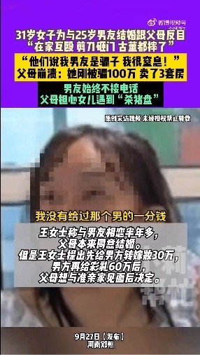 据@小莉赞理报谈,9月27日,河南郑州, 31岁女子为与25岁男友成婚跟父母反目,在家互殴、剪刀砸门、摔古董。